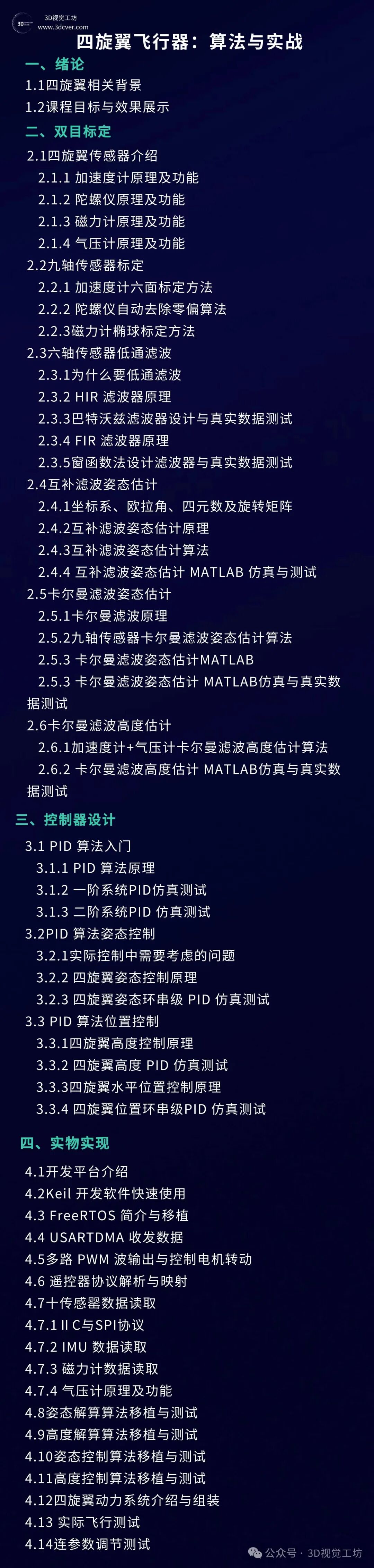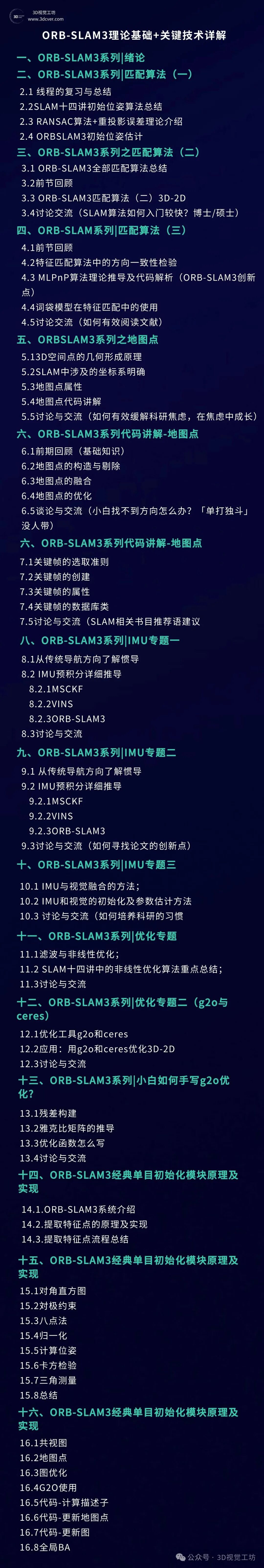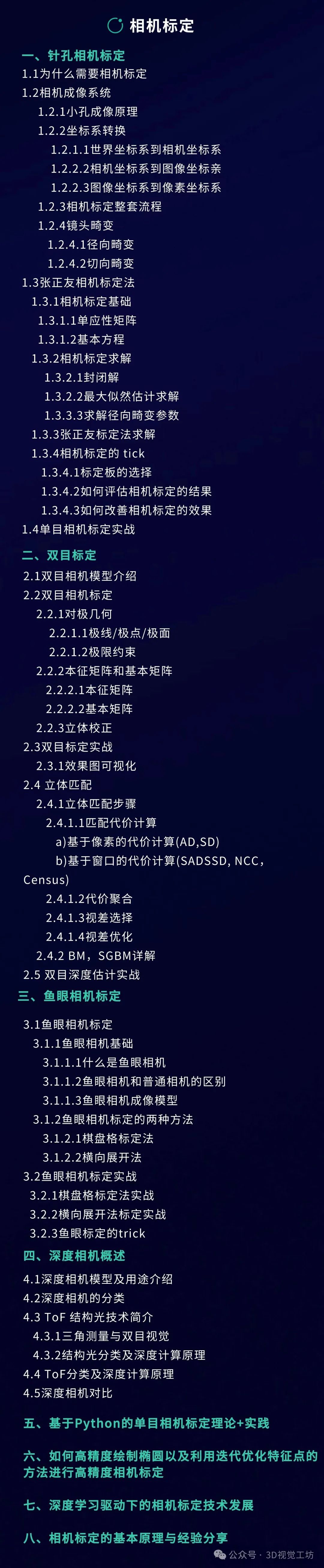 本课程主要包含两部分,分别是相机标定和3D视觉,相机标定包含单目、双目和鱼眼相机标定;3D视觉包含立体视觉、结构光和TOF,以立体视觉为主。课程提供对应数据与代码。