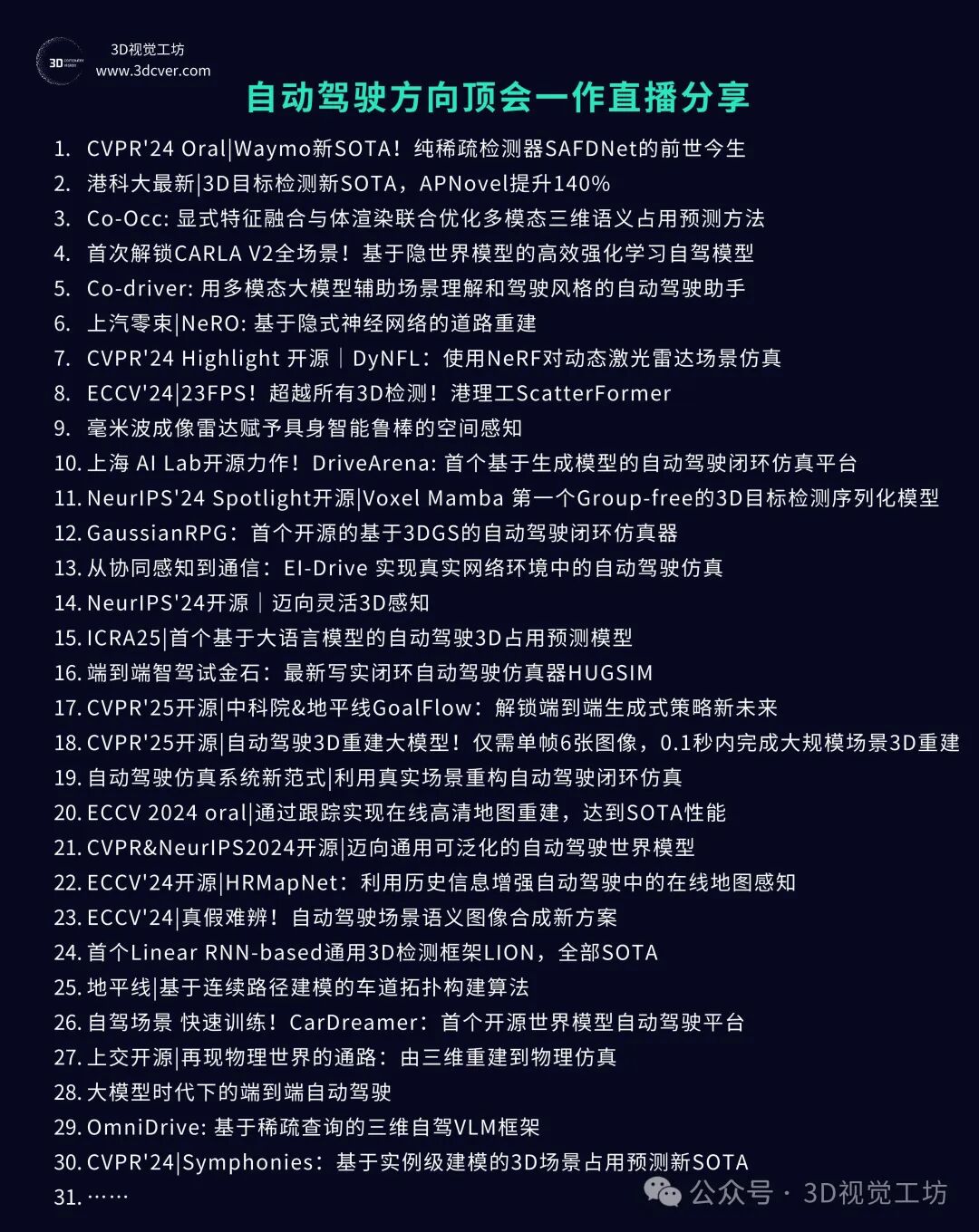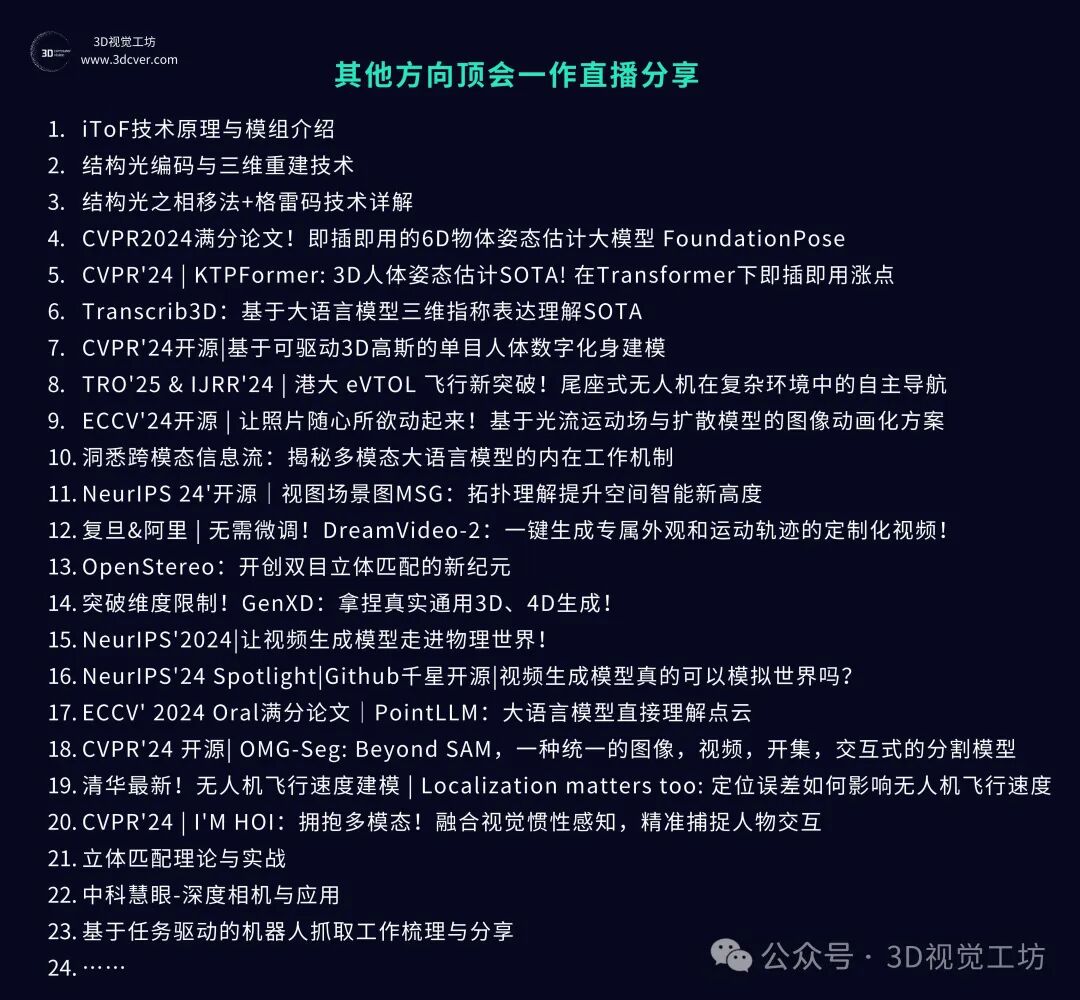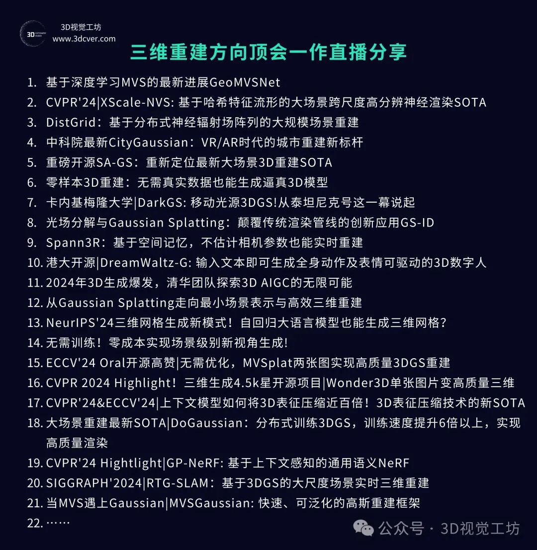 星球内已沉淀近超过100场3D视觉顶会论文直播回放,内容覆盖具身智能、自动驾驶、三维重建、数字人、扩散模型、3D生成等前沿领域。