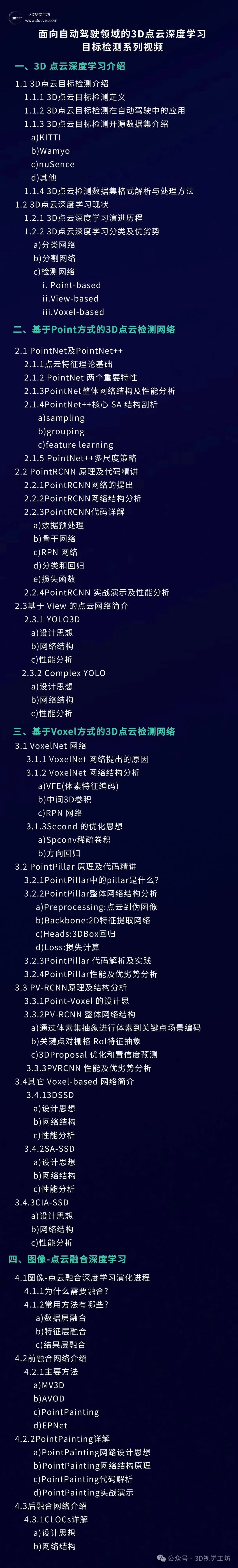 本视频教程以3D点云深度学习为主,对Point-based和Voxel-based系列的3D目标检测网络架构进行系统剖析和代码梳理,助力各位同学在点云深度学习更快的入门和更深的理解。