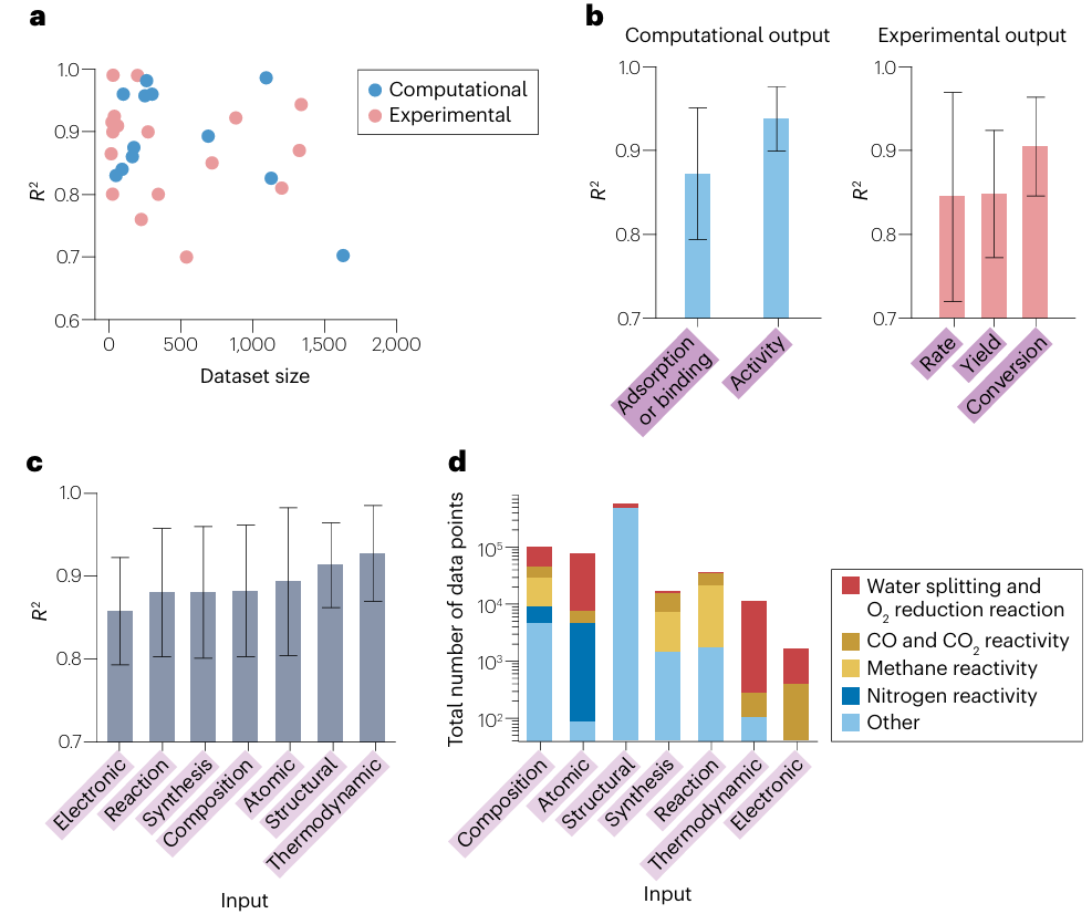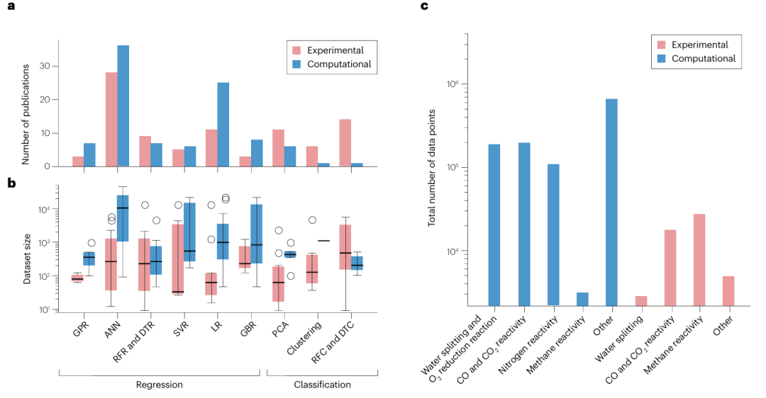 图2:在多相催化的机器学习研究中,研究发现的实验和计算数据集等文献计量分析。
