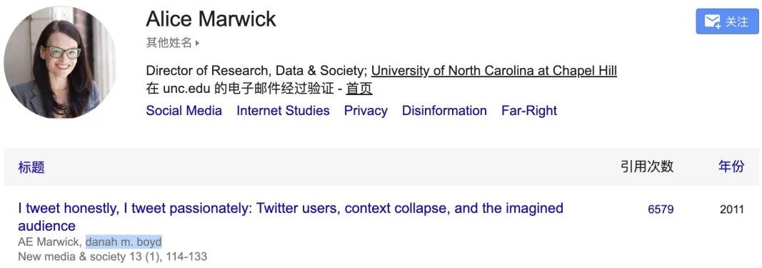 Alice E. Marwick:北卡罗来纳大学教堂山分校(University of North Carolina at Chapel Hill,UNC)传播学系副教授、信息、技术与公共生活中心(CITAP)联合创始人兼首席研究员。她专注于社交媒体技术的社会文化影响研究,主要学术贡献包括:网络媒体操纵与虚假信息、微名人现象(micro-celebrity)、网络隐私、语境崩塌(context collapse)。最新著作:《私域即政治:网络时代的隐私与社交媒体》(耶鲁大学出版社,2023年5月出版)