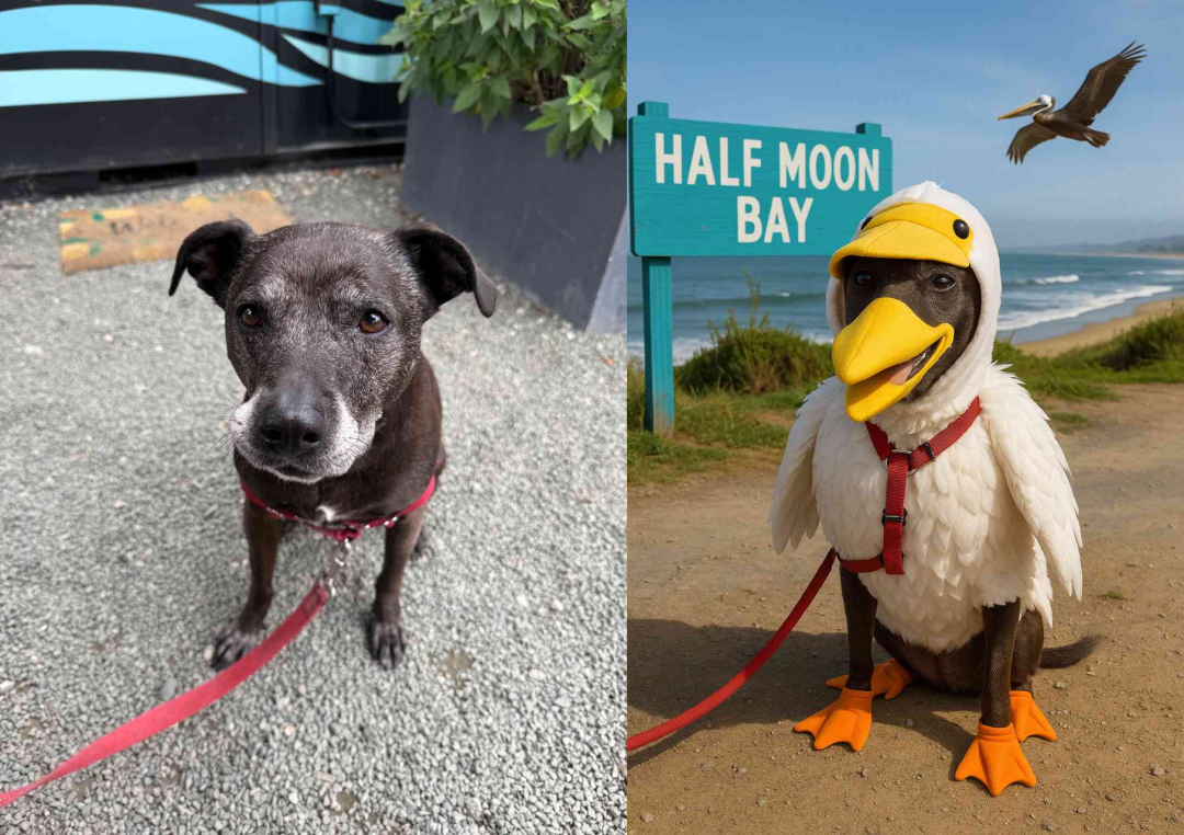开发者Simon Willison上传了狗狗的照片,请ChatGPT给它P个鹈鹕装,结果图上还加了个「Half Moon Ba」的牌子。