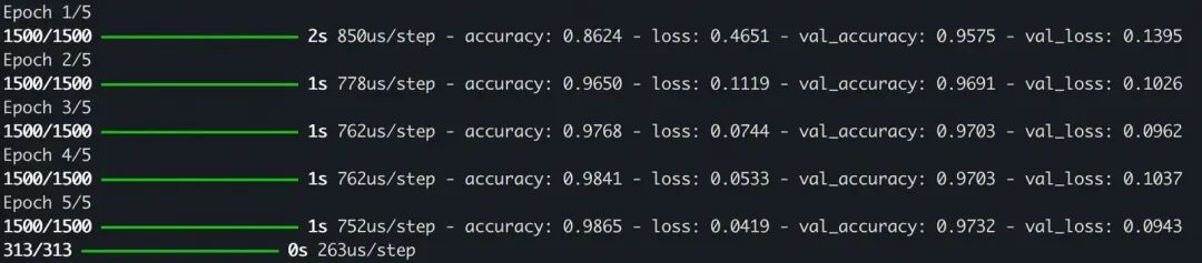 MNIST 训练集共有 60000 张图片,20% 的数据划分为验证集,训练集实际使用48000 张图片,每批 32 张图片,每个 epoch 需要 1500 步才能处理完所有训练数据。