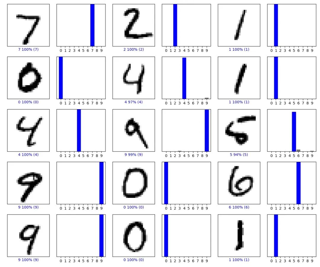 # 显示前 15 个测试图像的预测结果num_rows = 5num_cols = 3num_images = num_rows * num_colsplt.figure(figsize=(2 * 2 * num_cols, 2 * num_rows))for i in range(num_images): plt.subplot(num_rows, 2 * num_cols, 2 * i + 1) plot_image(i, predictions[i], test_labels, test_images) plt.subplot(num_rows, 2 * num_cols, 2 * i + 2) plot_value_array(i, predictions[i], test_labels)plt.tight_layout()plt.show()