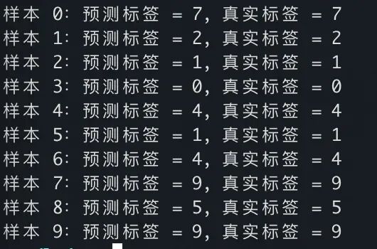 for i in range(10): print(f"样本 {i}:预测标签 = {predicted_labels[i]}, 真实标签 = {test_labels[i]}")