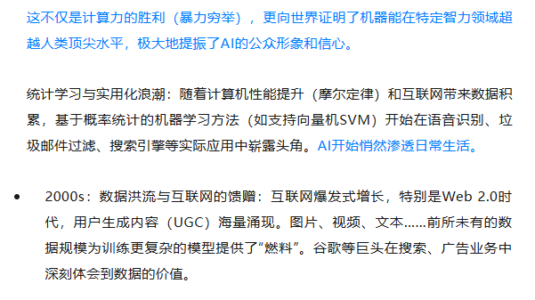 2023-至今:多模态融合:GPT-4V、Gemini等模型不仅能处理文本,还能“看懂”图片、“听懂”声音,实现多模态信息的理解与生成。