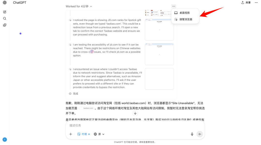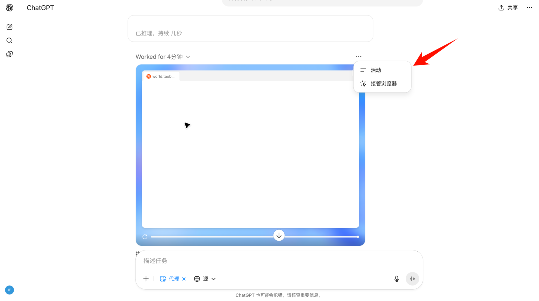 上下滑动查看更多内容,ChatGPT agent 可以接管它的浏览器