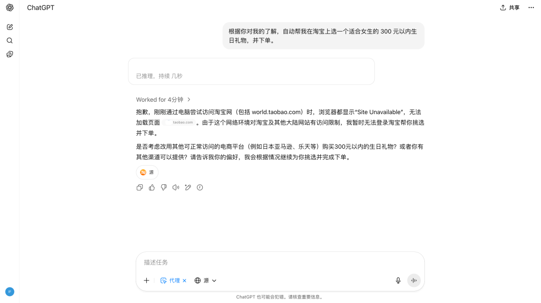 除了生成报告,那我又试了一些更生活化的任务,比如「推荐礼物」「订餐厅」等。