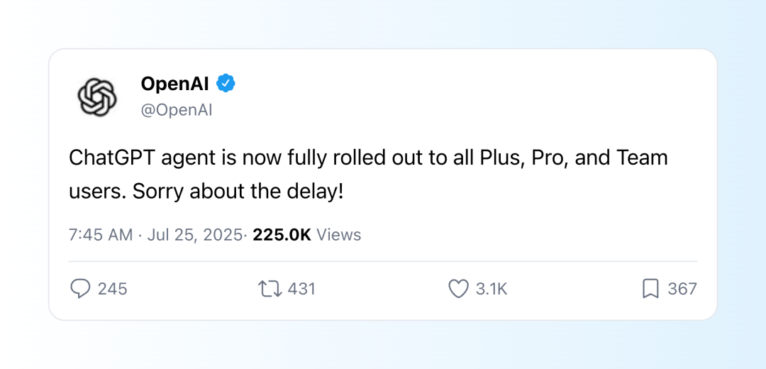 OpenAI 今晨发 X 宣布 ChatGPT agent 向全部的 Plus、Pro 以及 Team 用户开放