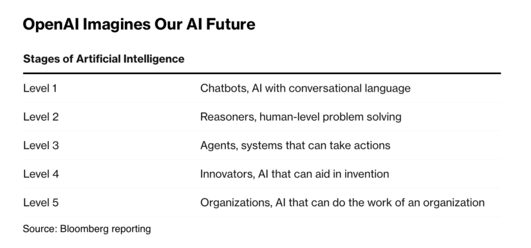 此前彭博社报道的 OpenAI 对于 AI 发展的几个阶段,Agent 位于第三个阶段。