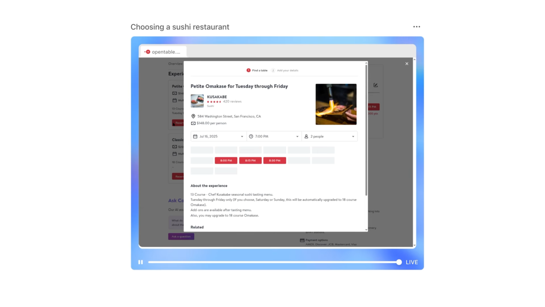 后面即使尝试让他使用 Amazon 购物它也还是访问不到对应的网站,不过让他选一家好吃的餐厅,在 Google Maps 上预订座位,它成功做到了。