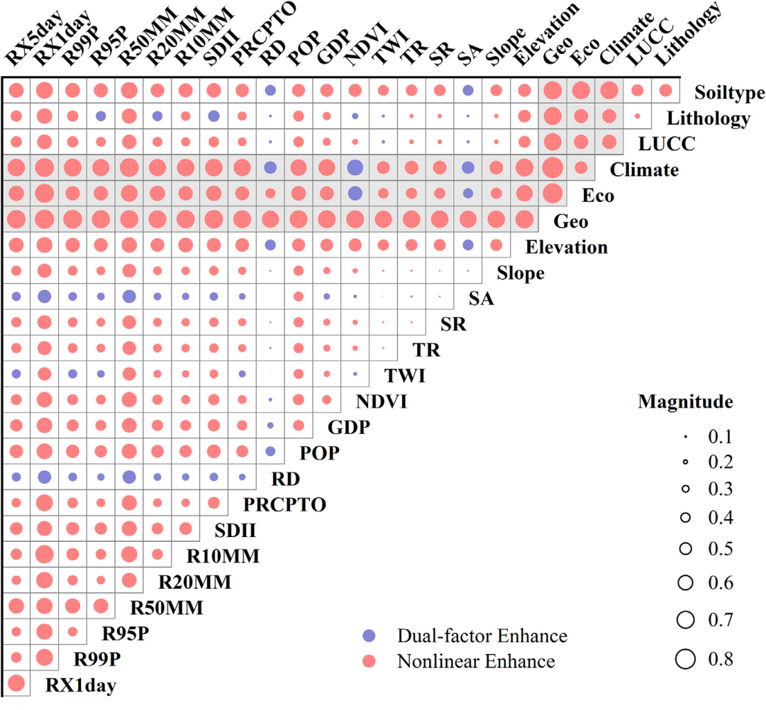 Fig. 6. Interaction effects of the flood disaster drivers at the provincial scale based on the OPGD interactive detector.