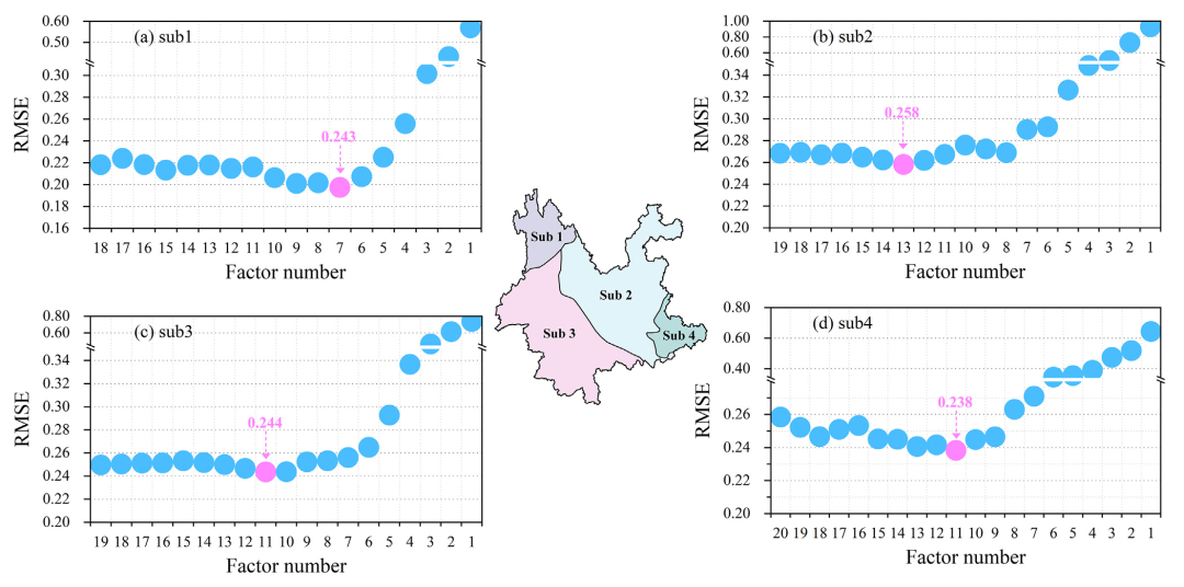 Fig. 8. Identification of the essential driving factor sets in the four subregions of Yunnan Province based on the OPGD–RFE–LGBM coupled model. The pink points indicate the minimum RMSE. (For interpretation of the references to color in this figure legend, the reader is referred to the web version of this article.)