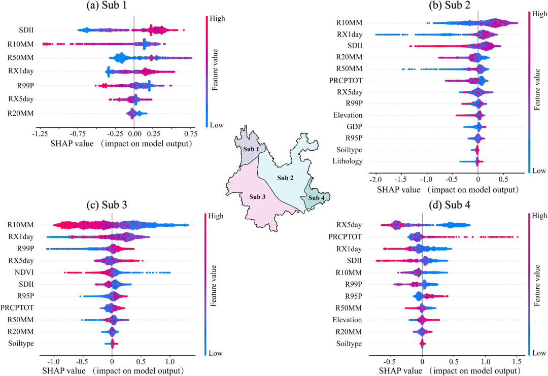 Fig. 9. Manners and degrees of influence of the essential driving factors on the distribution of flood disasters. (a), (b), (c) and (d) refer to SUB1, SUB2, SUB3, and SUB4, respectively. Each point represents a data sample, its color showing the magnitude of feature value. The point’s horizontal placement reflects the SHAP value of the driving factor, signifying its impact intensity. Together, the x-axis position and point color depict the link between factors and flood disasters.