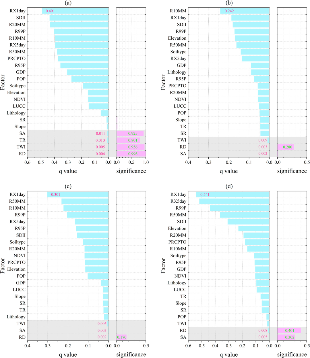 Fig. 7. Ranking of q values for flood disaster driving factors at the subregional scale based on the OPGD factor detector. Panels (a), (b), (c) and (d) refer to SUB1, SUB2, SUB3, and SUB4, respectively.