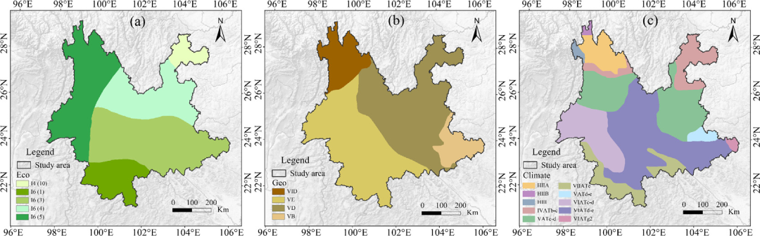 Fig. 2. Spatial zoning scheme in Yunnan Province. (a) Eco, the definition of ecology zoning codes following Fu et al. (2001). (b) Geo, the definition of geomorphic zoning codes following Wang et al. (2020). (c) Climate, the definition of climate zoning codes following Zheng et al. (2010).