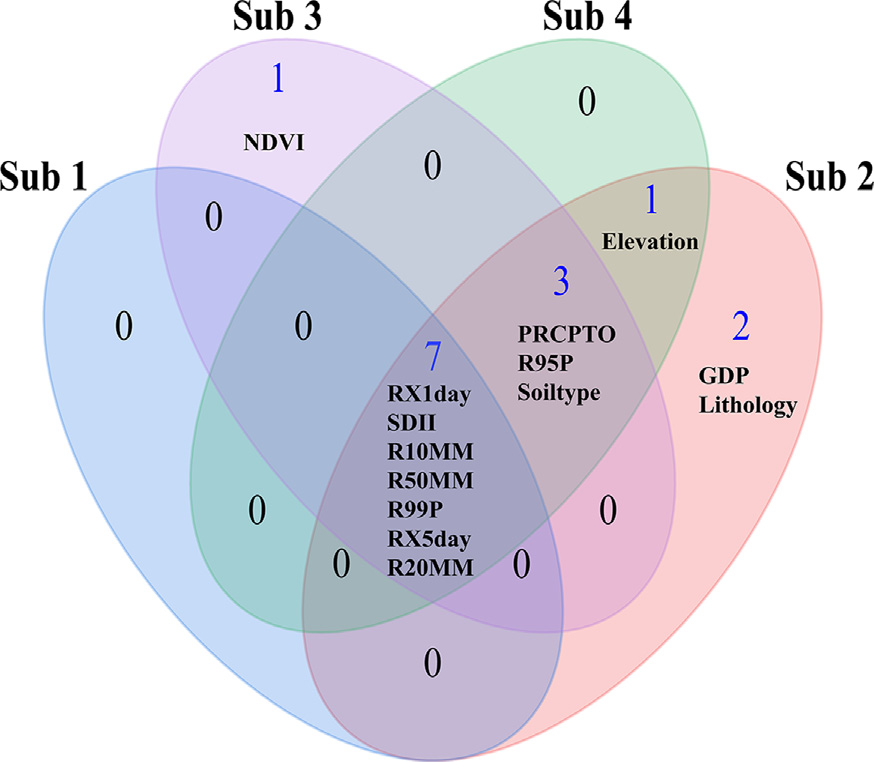 Fig. 10. Venn diagram showing overlaps in essential flood disaster driving factors among the four subregions of Yunnan Province.