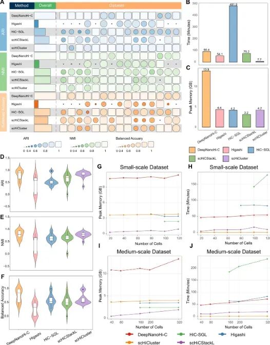 通过结合基于多尺度模式的预测,DeepNanoHi-C 采用双通道预测网络来捕获复杂的相互作用信息,从而促进对染色质结构进行更全面的下游分析。本文运用一系列 scNanoHi-C 数据集对 DeepNanoHi-C 进行了评估,并将其性能与多种现有工具进行了比较。结果表明,DeepNanoHi-C 在聚类准确率、插补质量以及捕获细粒度染色质相互作用的能力方面均优于其他方法。它在区分不同细胞类型之间细微的染色质结构变异方面表现出色,并有效地恢复了传统方法难以捕捉的复杂染色质相互作用。此外,DeepNanoHi-C 在处理稀疏数据方面表现出色,与现有方法相比显著减少了插补误差。我们的分析还揭示了跨物种保守的基因组结构,为基因组功能的进化保守性提供了新的见解。这些结果证实了 DeepNanoHi-C 是分析 scNanoHi-C 数据的强大工具,使其成为在单细胞水平上研究三维基因组结构的宝贵资源。图1 DeepNanoHi-C 的综合评估:跨 scNanoHi-C 数据集的聚类性能、效率和可扩展性(图源自Nucleic Acids Research)https://academic.oup.com/nar/article/53/13/gkaf640/8196083内容为【iNature】公众号原创,