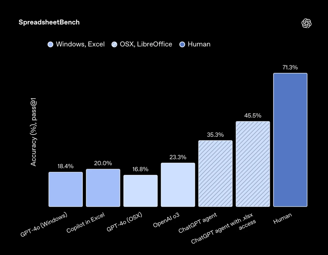 在 SpreadsheetBench 上,ChatGPT 代理的准确率达到了 45.5%,而 Copilot-in-Excel 仅为 20%。OpenAI 还声称,ChatGPT 代理在 DSBench 和 BrowseComp 上取得了一流的成绩,在 Humanity's Last Exam 上一次通过率达到了 41.6%,但这些基准测试都假设代理被允许运行代码和浏览。