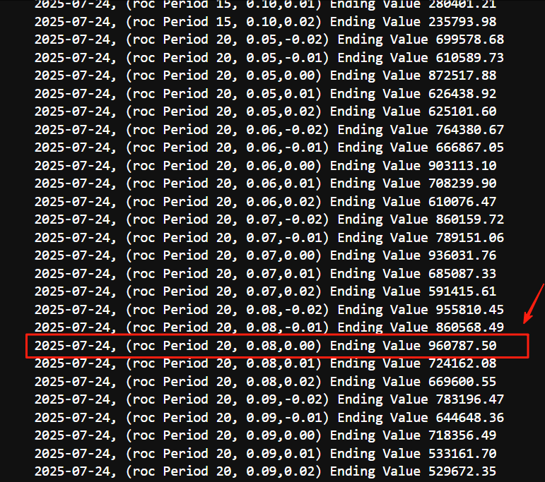 大家之前问的,为什么参数是20,0.08,0,我们对参数进行遍历之后,得到的最优参数集合,而且这个参数集还比较稳定的。搞钱的意义在于,当父母需要用钱时,孩子想买喜欢的玩具,想上培训班时,你能拿得出手。这就是搞钱的意义吧。以前觉得这个词并不好,现在觉得这个词其实是人生大智慧。不过,有时候也就是不想给自己过大的压力,所以,总给自己一些退路。家庭和睦,家长健康平安,财务比较自由。可能超过99%的人。守好底线,一些适当的小冒险,可以承受的风险,是值得出手的。否则人生多无趣啊。到老了,会不会后悔,当时为什么不勇敢一点,大胆一点,怕什么呢?内心的空虚感可能源于你尚未找到真正属于自己的、发自内心的驱动力和价值感。你现在的状态,正是开始探索真正属于自己意义的最佳时机。意义感就像藏在生活褶皱里的微光——它不会在宏伟目标达成时突然降临,却总在你为小事倾注真心时悄然点亮。