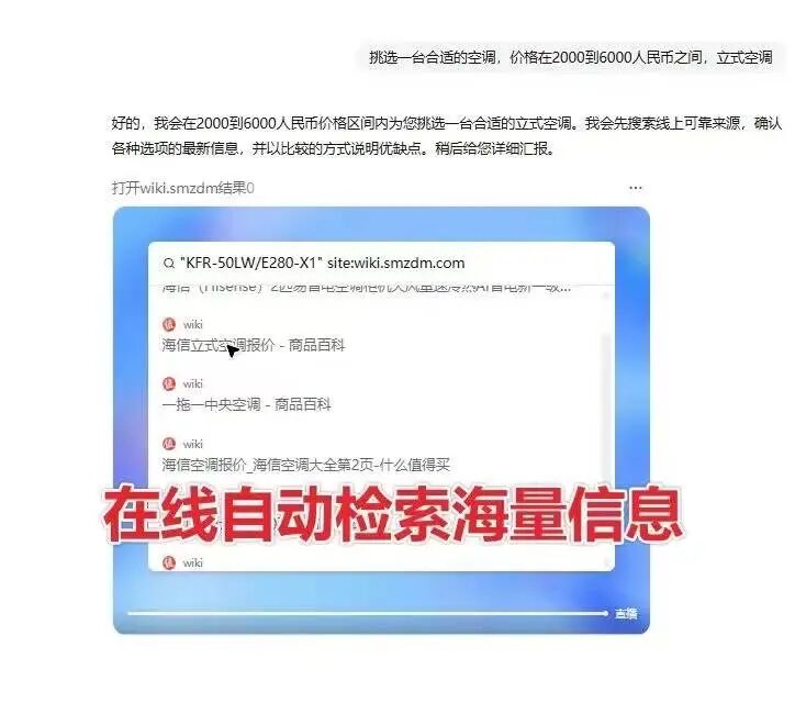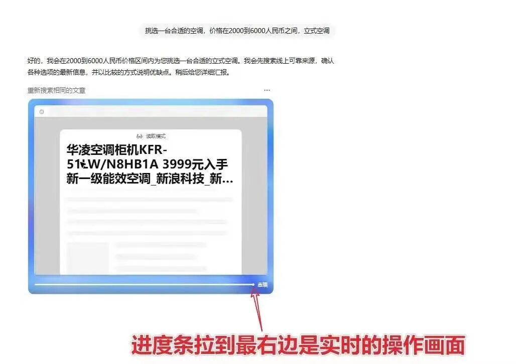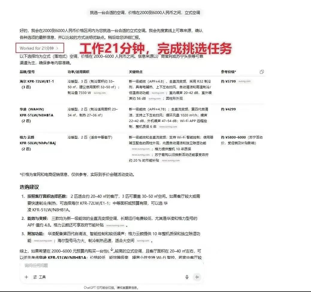 这意味着,ChatGPT不再被困在对话框里了!它现在能像我们一样操作电脑和浏览器,打开网站、浏览页面、登录账户,然后进行深度分析。下面实例演示下,只需在输入框中直接说"挑选一台合适的空调,价格在2000到6000人民币之间,立式空调",它就会全程搞定!目前这个超强功能仅向Plus(20美元/月)和Pro(200美元/月)用户开放。