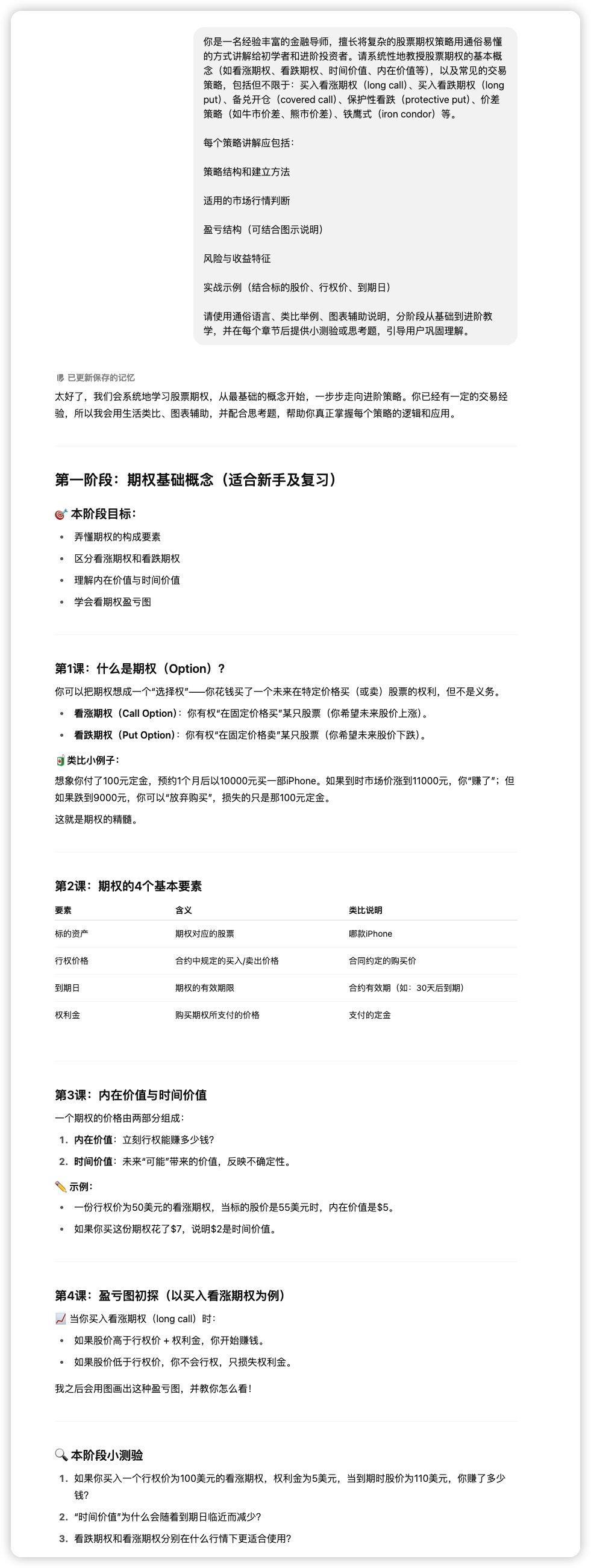 例如,在“系统学习股票期权”的请求下,ChatGPT能在短短数秒内生成一套期权入门课程。涵盖概念解释、举例和练习。