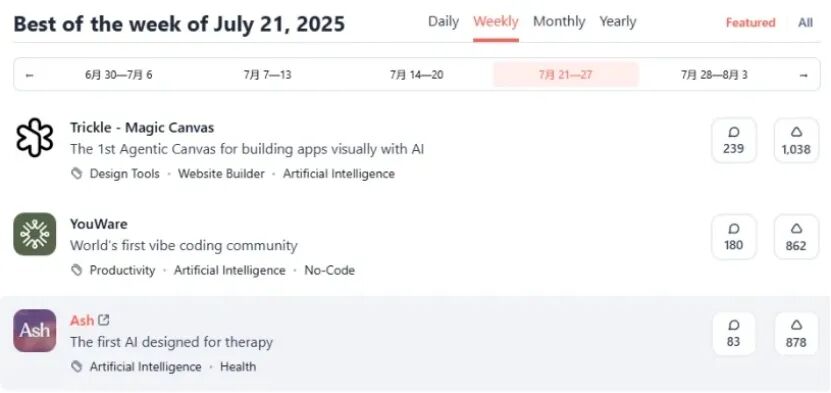 3、心理疗愈应用 Ash 登上 Product Hunt 周最佳产品榜 Top3(7.21-27)。该产品致力于通过自研的心理学基座大模型(融合 CBT、DBT 等主流疗法),让用户获得更接近真实对话的疗愈体验。Ash 支持文字、语音沟通,上下文持续记忆与定制化反思报告等功能。Ash 的制造公司 Slingshot AI 成立于 2022 年,Ash 发布于 2024 年。据 crunchbase 显示,Slingshot AI 目前已累计融资 1.23 亿美元。(Z Potentials、crunchbase)