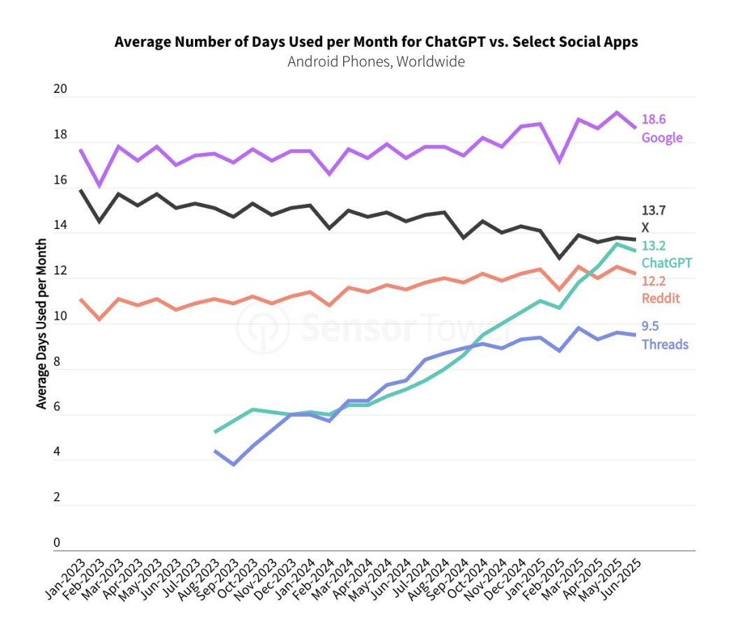 9、根据 Sensor Tower 数据,截至 2025 年 6 月,ChatGPT 安卓端全球用户平均月活跃天数达 13.2 天,超越 Reddit(12.2 天),逼近 X(13.7 天),成为用户最常用的应用之一。( Sensor Tower )