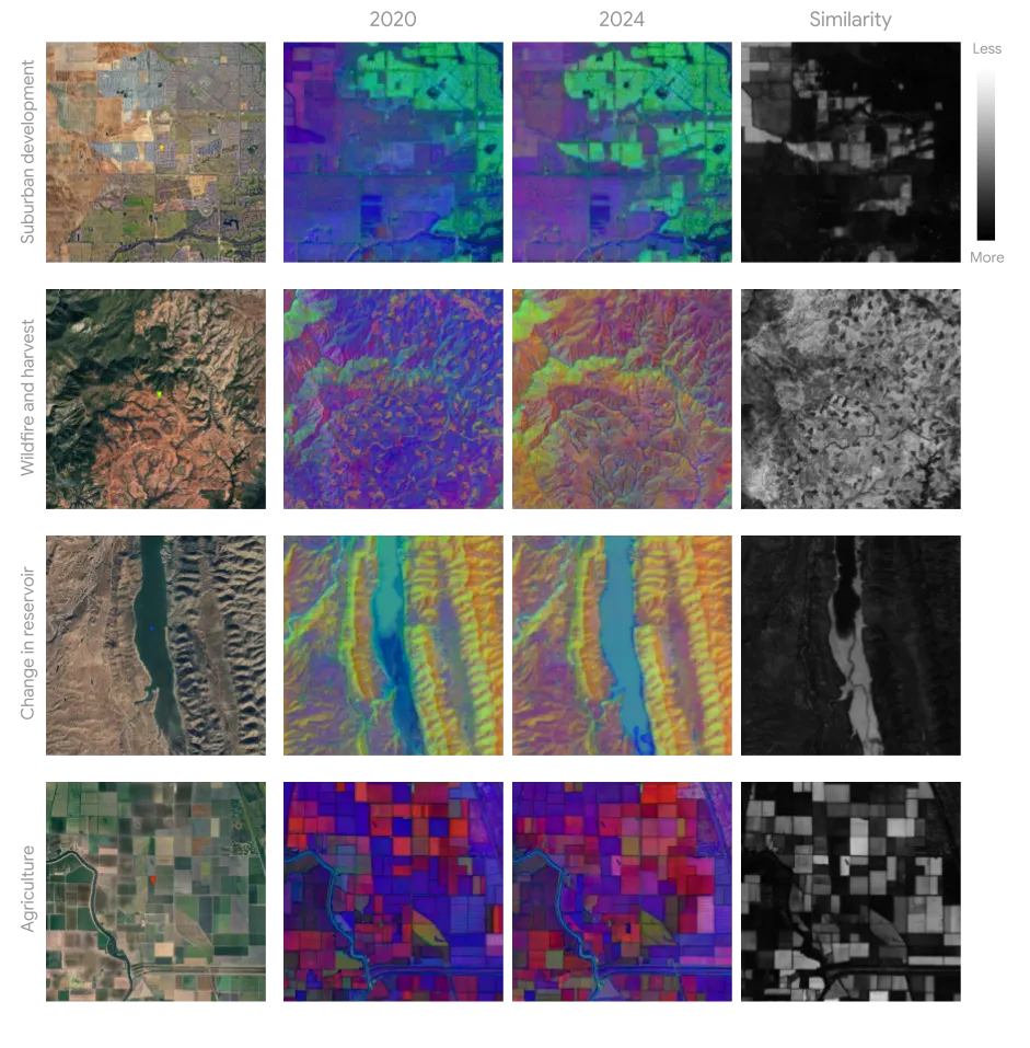 通过比较同一像素在不同年份的嵌入向量,可以轻松监测城市扩张、野火恢复、水库水位变化等。