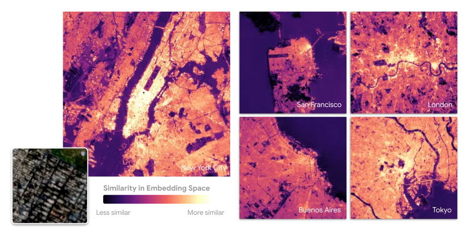 只需选择一个目标像素,嵌入向量即可通过简单的点积计算,快速在全球范围内定位相似地表和环境条件的区域。