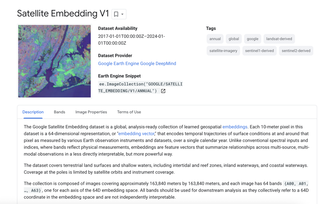 https://x.com/bilawalsidhu/status/1950580970907648234 https://deepmind.google/discover/blog/alphaearth-foundations-helps-map-our-planet-in-unprecedented-detail/ https://medium.com/google-earth/ai-powered-pixels-introducing-googles-satellite-embedding-dataset-31744c1f4650