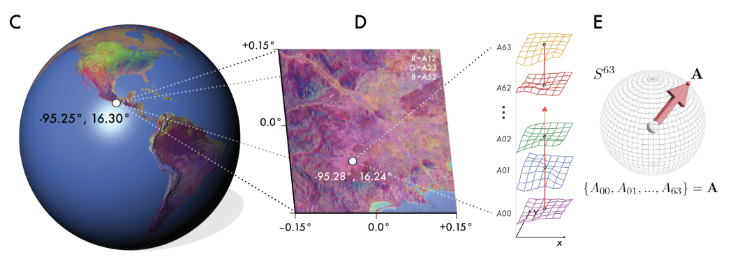 比如,一个像素的嵌入不仅反映其光谱特性,还包含周边环境、季节性变化(如植被物候、积雪)以及地形和气候特征。