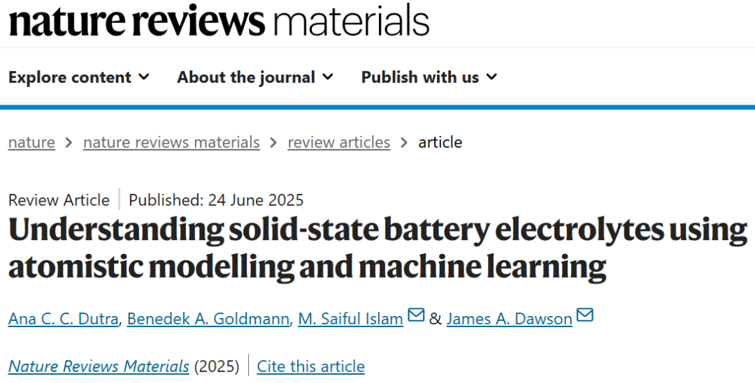 2025年6月24日,Nat. Rev. Mater.在线发表了英国纽卡斯尔大学James A. Dawson和牛津大学M. Saiful Islam课题组的综述论文,题目为《Understanding solid-state battery electrolytes using atomistic modelling and machine learning》。