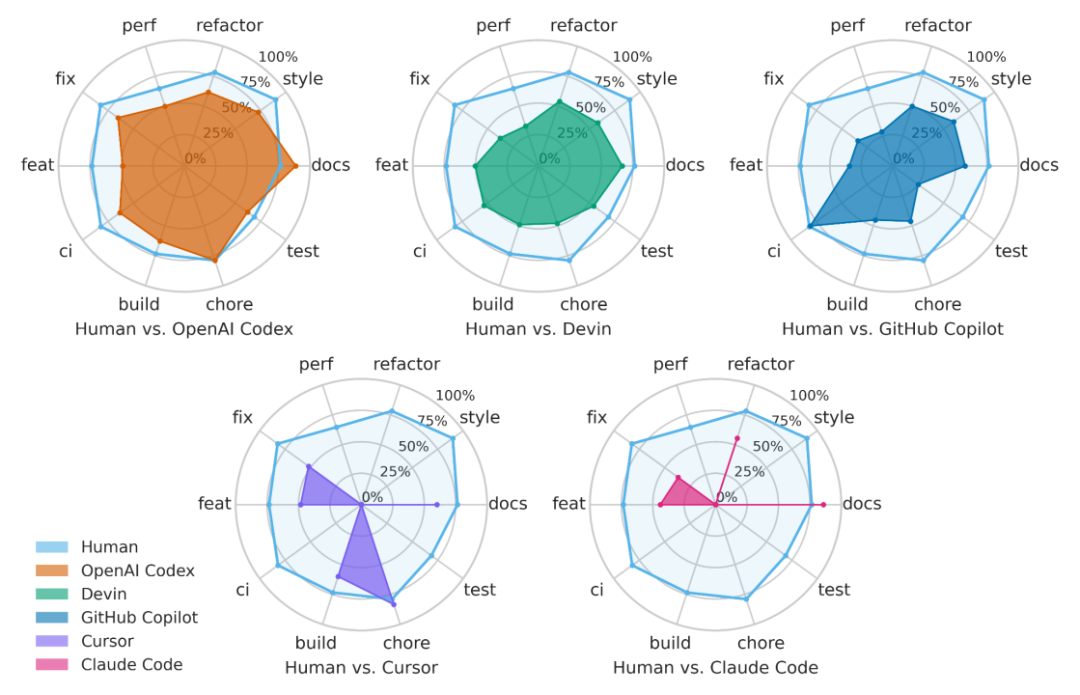 不过,AI在文档编写(docs)方面展现出独特优势。OpenAI Codex的文档类修改接受率高达88.6%,显著超过人类的76.5%。研究推测,文档生成更依赖语言能力而非复杂逻辑推理,这正契合当前大语言模型的核心优势。