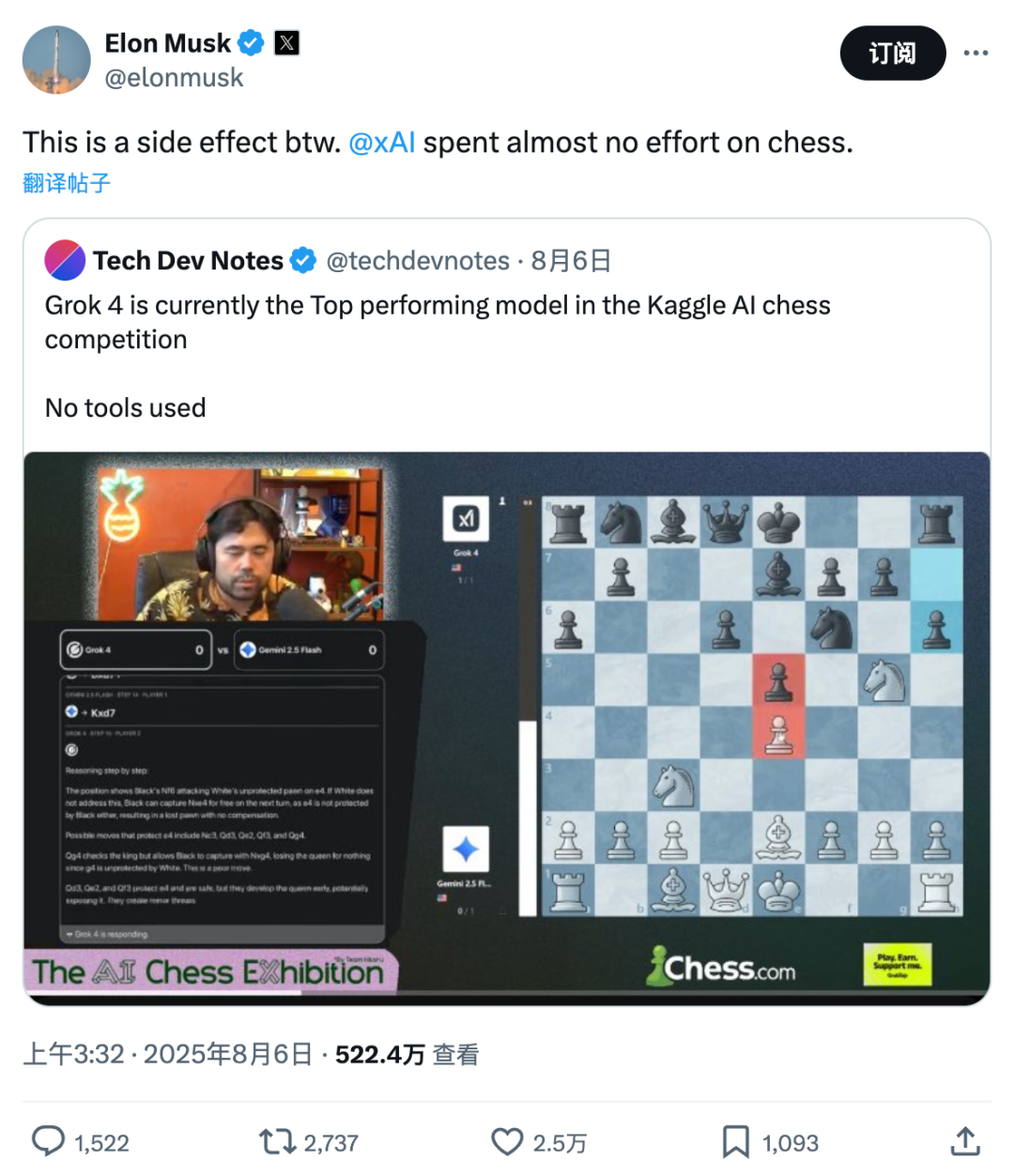 在这场约 55 步的残局中,Grok 4 执黑凭借“和棋胜出”规则优势锁定胜利,惊险晋级。