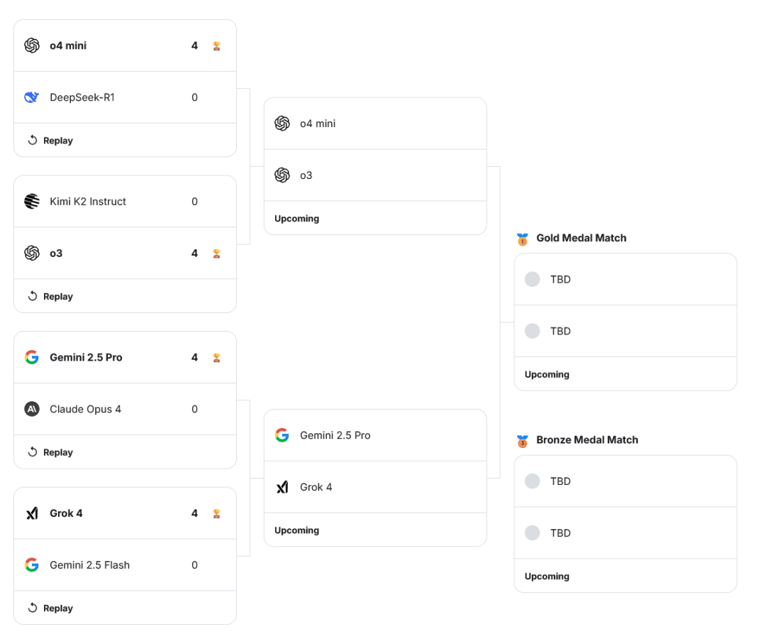 Gemini 2.5 Pro、o4‑mini、Grok 4 与 o3,分别击败 Claude 4 Opus、DeepSeek R1、Gemini 2.5 Flash 与 Kimi k2。