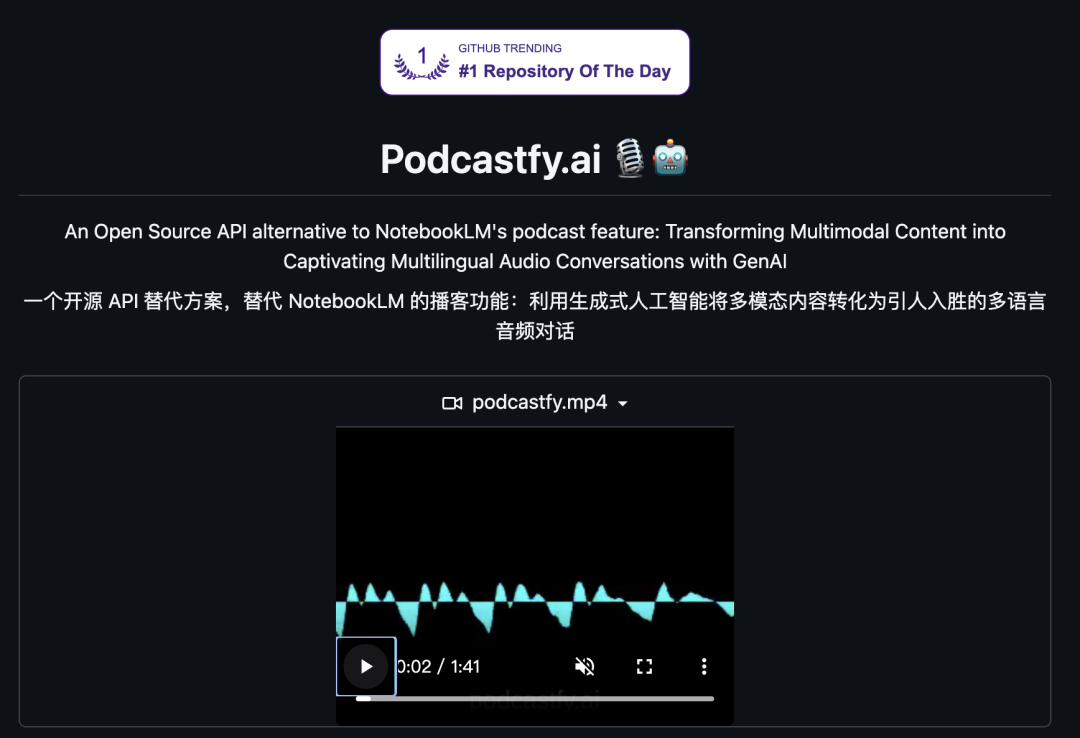 这个开源项目想替代 NotebookLM 的播客功能,能把文字、图片、网页甚至视频等内容自动转成像播客一样的对话音频。它基于 AI 大模型,帮你把枯燥的资料变成轻松好懂的双语或多语种聊天内容。不管是短科普还是长访谈,它都能搞,还能选不同的 AI 模型和语音引擎,比如 OpenAI、Google 的语音。04