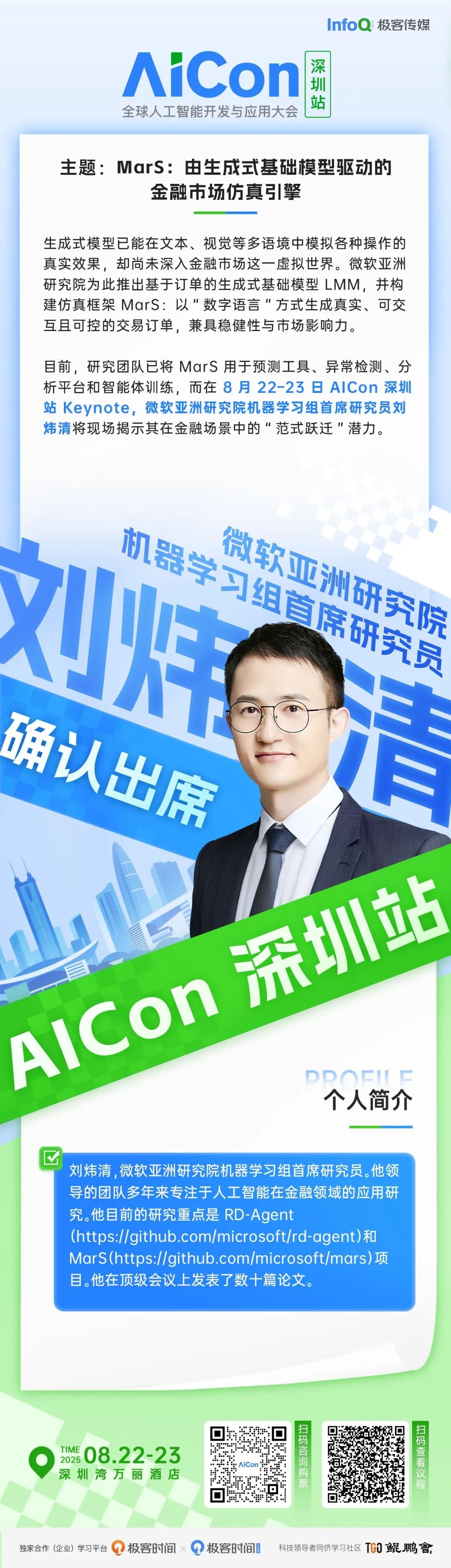 微软亚洲研究院机器学习组首席研究员刘炜清已确认出席,并将在 Keynote 主题演讲发表题为《MarS:由生成式基础模型驱动的金融市场仿真引擎》的主题分享。生成式模型旨在在不同语境中模拟各种操作的真实效果,从文本生成到视觉特效。尽管在构建真实世界模拟器方面投入了大量精力,但生成式模型在虚拟世界(如金融市场)中的应用仍未得到充分探索。在金融市场中,生成式模型能够模拟具有多种行为特征的参与者所产生的复杂市场效应,从而在不同市场条件下实现交互,并为策略训练、提供无真实金融风险的环境。此类模拟依赖于金融市场中最精细的结构化数据——订单,以打造最为逼真的仿真场景。