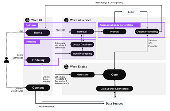 为了确保查询的准确性和减少幻觉生成,WrenAI使用建模定义语言来编码架构、指标、连接和定义,为大语言模型提供精确的上下文。其语义引擎通过架构嵌入和基于相关性的检索,确保查询内容丰富、架构嵌入和准确的 SQL 生成。
