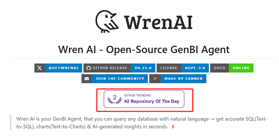 目前,WrenAI在Github已经超过9000颗星,并且拿下了每日增长趋势第二名,整体实力非常强。