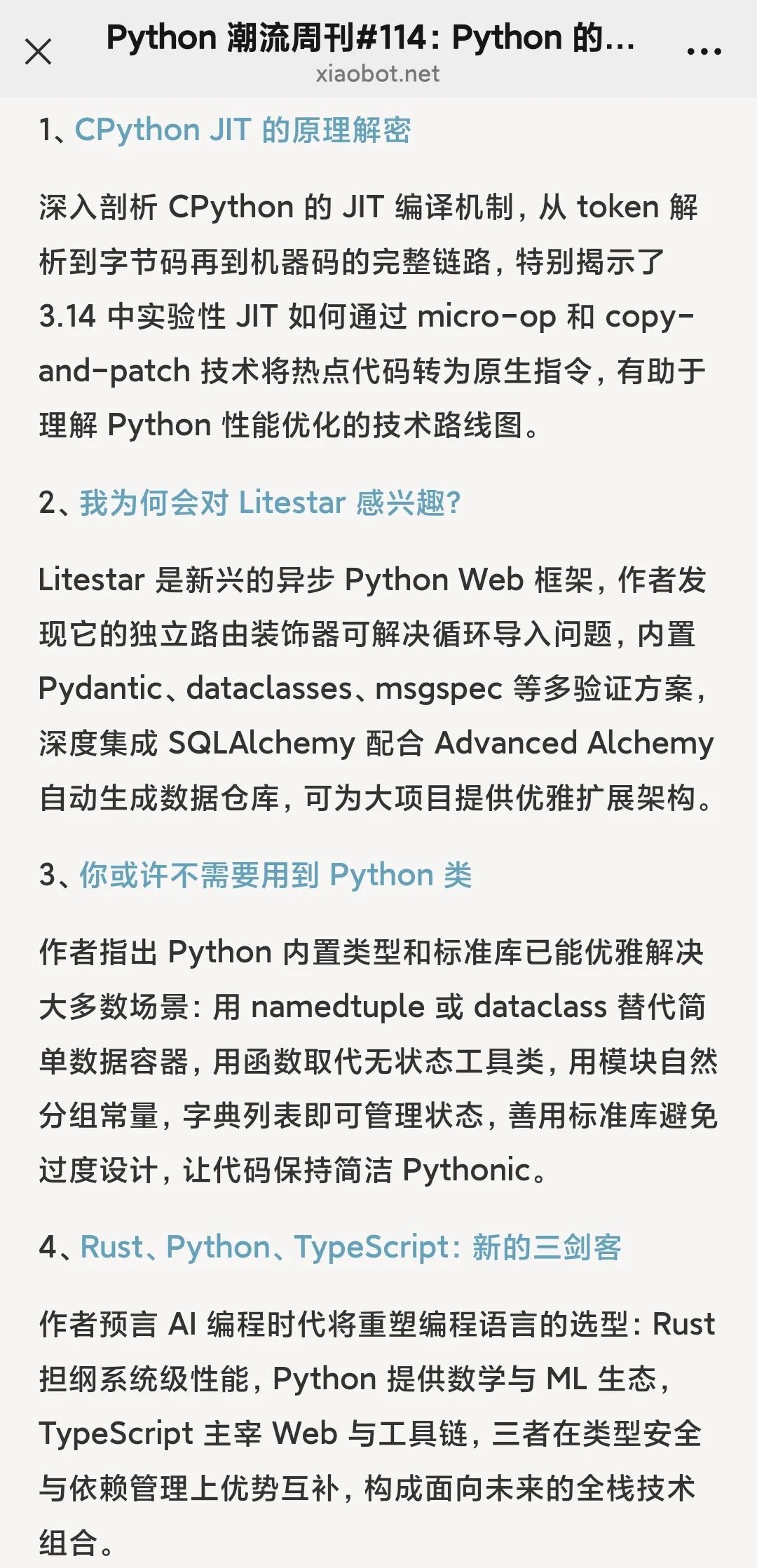周刊实行付费订阅制,年费 148 元,平均每天 4 毛钱,为你精准筛选高质量技术内容。在信息洪流中为你淘金,助力技术视野拓展和职业发展,欢迎订阅:https://xiaobot.net/p/python_weekly
