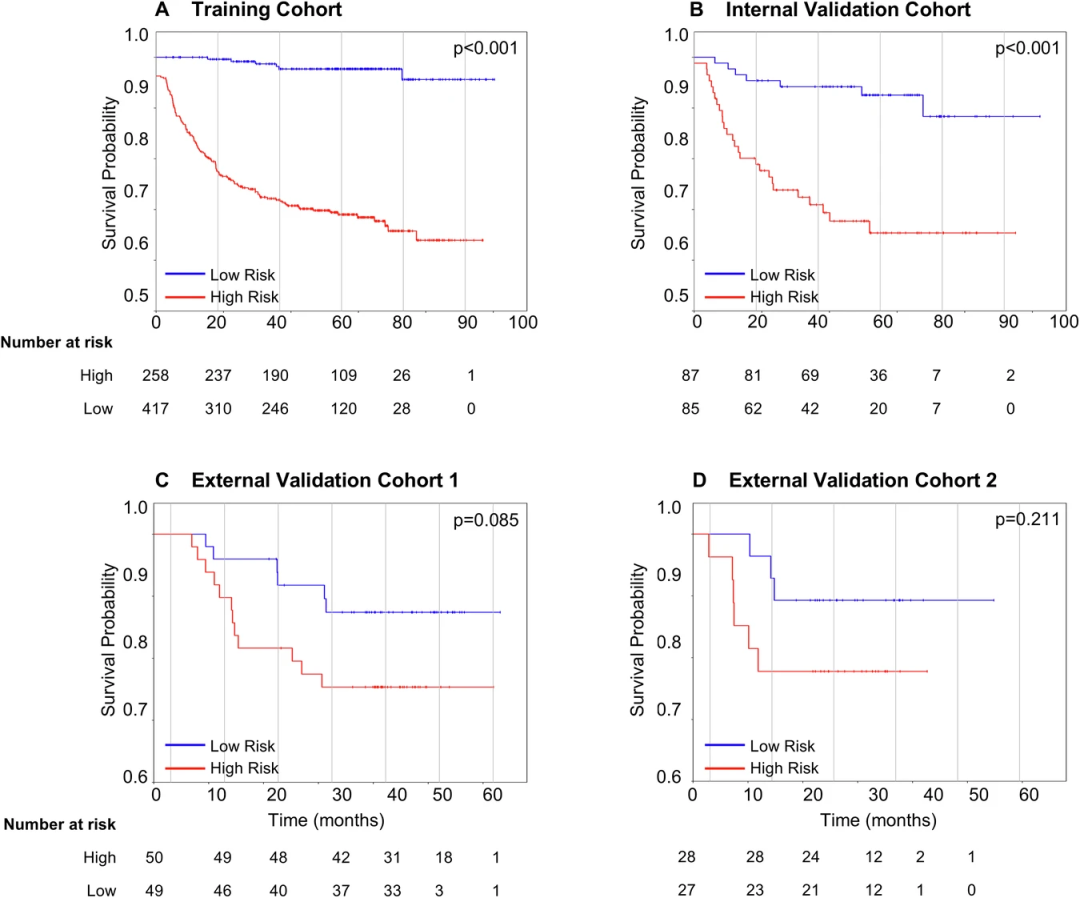 图2. 在训练、内部验证和外部验证队列中,使用CerviPro模型预测DFS的Kaplan-Meier生存曲线