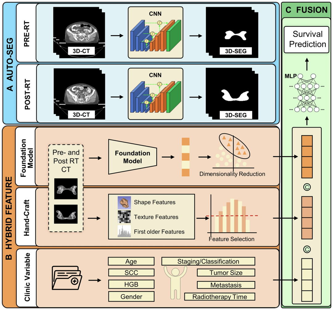 深度特征:使用基于3D U-Net的自动分割网络处理治疗前后盆腔CT影像,随后利用预训练基础模型提取8,192个高维特征;通过主成分分析(PCA)将其降维至30个特征,可保留关键预后信息,并最大限度减少冗余。