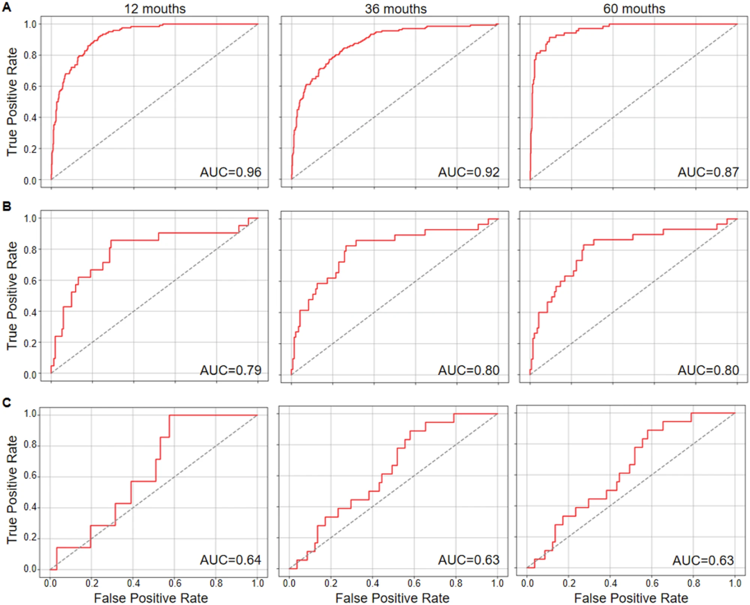 此外,随着预测时间延长至60个月,各队列的AUC值均