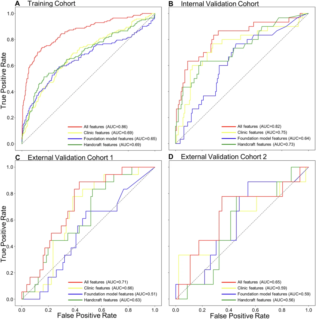 图4. 使用不同特征集跨队列进行DFS预测的ROC曲线和AUC值