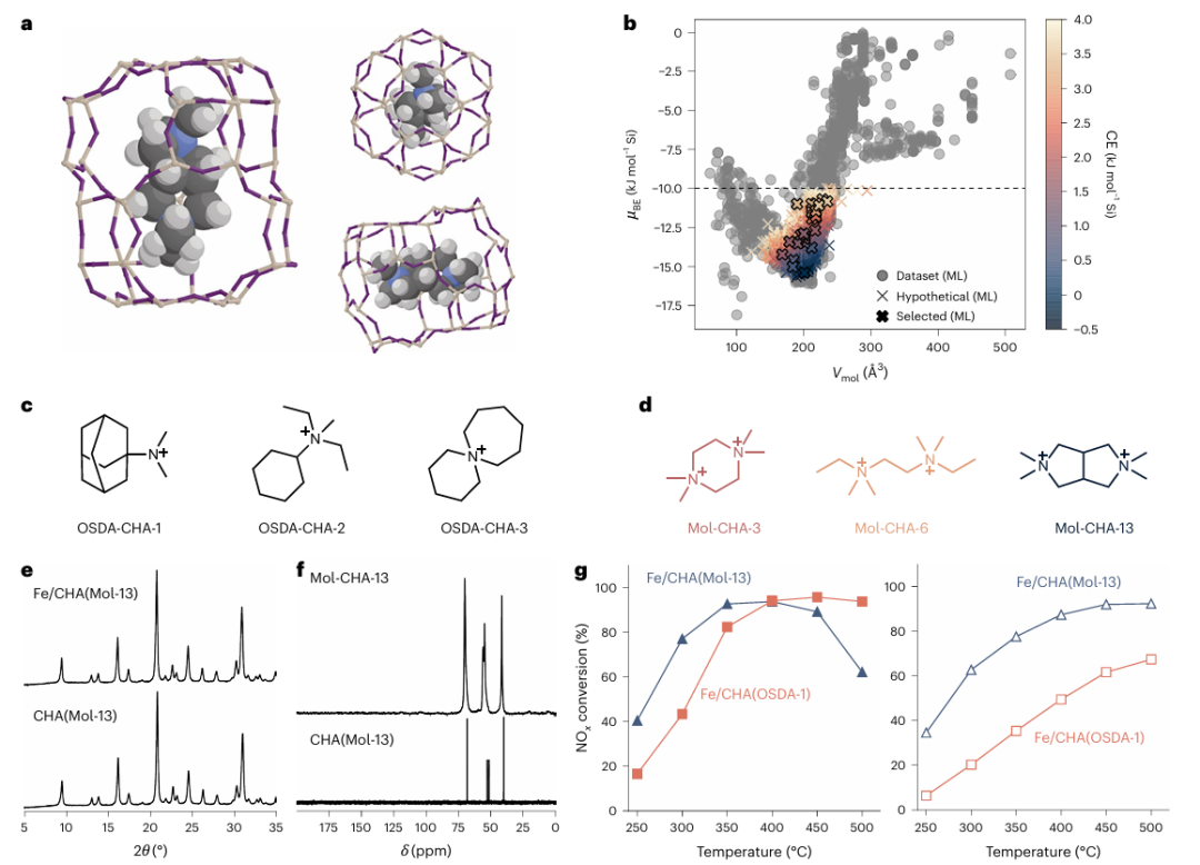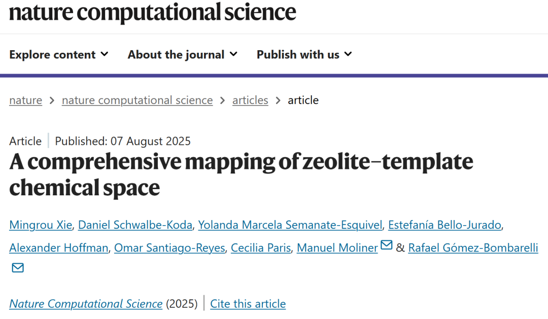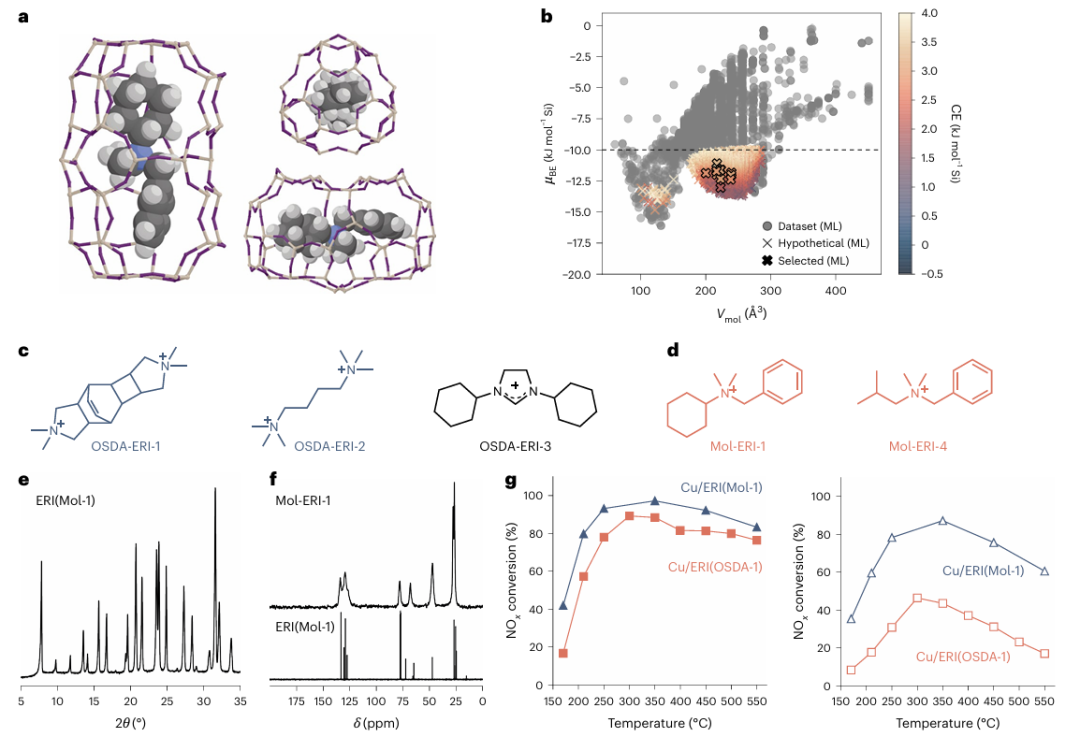 230万种虚拟OSDA分子库,结合结合能预测模型,从近5亿沸石-分子对中筛选出新型OSDA分子,成功合成了高硅ERI沸石(硅铝比12.3)和无钠富铝CHA沸石(硅铝比4.9)。实验表明,两类沸石在氮氧化物(NOₓ)催化净化中表现出优异的水热稳定性,为工业催化剂设计提供了新范式。平台与数据已开源,将加速沸石材料的定向合成。Xie, M., Schwalbe-Koda, D., Semanate-Esquivel, Y.M. et al. A comprehensive mapping of zeolite–template chemical space. Nat Comput Sci (2025). https://doi.org/10.1038/s43588-025-00842-5声明:仅代表译者观点,如有不科学之处,请在下方留言指正!