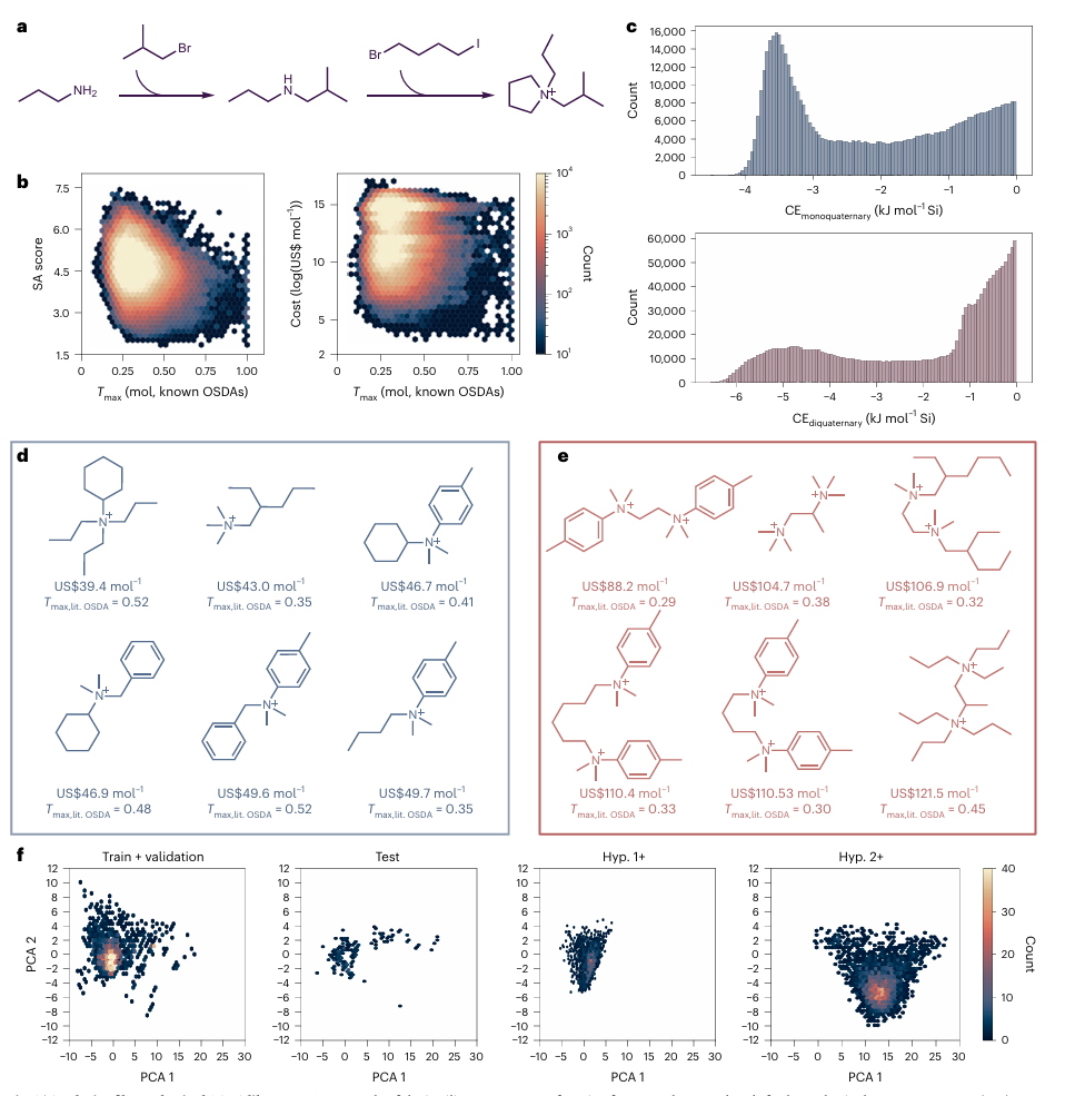 还设计了捕捉沸石分子匹配的预测任务,在数十万个数据点上,训练了这些任务的预测模型,并从商业上可获得的前驱体中,列举了230万个合成可访问的、假设有机结构导向剂OSDA类分子。