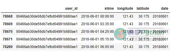 stay,move = tbd.mobile_stay_move(data,params,col = ['user_id','stime','longitude', 'latitude'])结果如下所示。