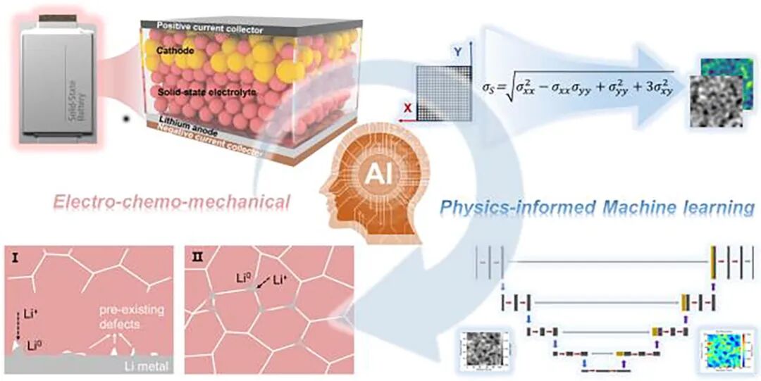固态锂金属电池(SSLMB)由不可燃固态电解质、高容量正极和锂(Li)金属负极构成,展现出构建高能量密度与高安全性电池系统的巨大潜力。然而,锂金属负极反复进行的电化学沉积与剥离过程会在负极-电解质界面引发枝晶形成,带来短路风险。该界面失效的内在机制尚不明确。通过多物理场模拟对固态电解质中应力分布、相对损伤及裂纹形成进行可视化研究,是理解SSLMB负极-电解质界面处的电化学-力学失效的一个重要途径。关于锂枝晶萌生与扩展的关键因素——包括缺陷几何形态、空隙数量密度及锂枝晶分布等——已得到系统性研究,积累了大量相关知识。然而,这些计算基于有限元方法,高度依赖于精细单元尺寸,导致计算量大且耗时较多。