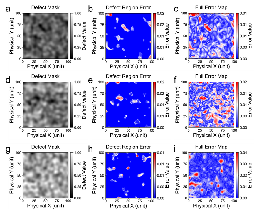 图5. SE-UNet模型应力场预测的空间分析。最高DER样本的(a) 掩码缺陷分布,(b) 缺陷区域预测误差,(c) 总体误差。中位DER样本的(d) 掩码缺陷分布,(e) 缺陷区域预测误差,(f) 总体误差。最低DER样本的(g) 掩码缺陷分布,(h) 缺陷区域预测误差,(i) 总体误差。